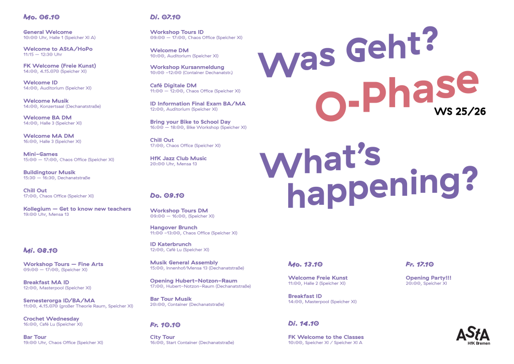 For all questions and uncertainties that may arise, you can reach the asta speaker for culture via asta-kultur@hfk-bremen.de, your student councils via fsr-id@hfk-bremen.de, fsr-musik@hfk-bremen.de, fsr-dm@hfk-bremen.de, fsr-fr@hfk-bremen.de and the hej.team via hej@digitalmedia-bremen.de.